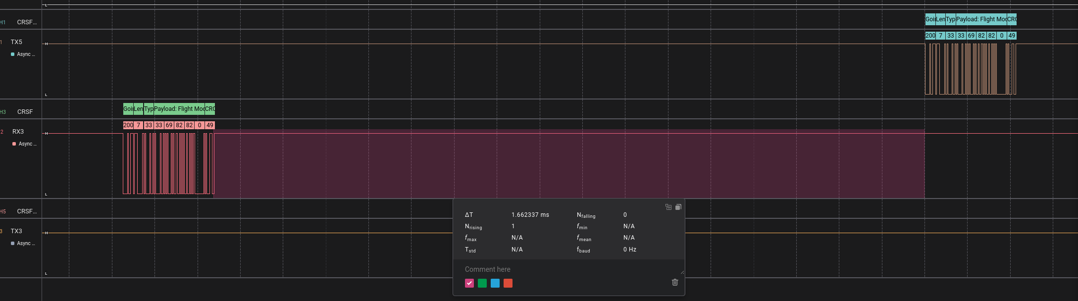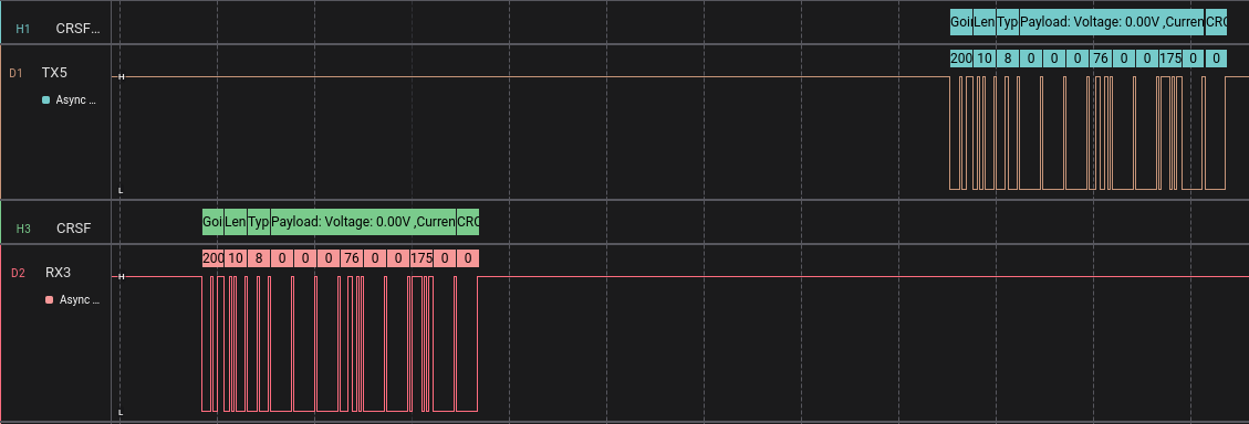 Shown below are several screenshots from the Saleae Logic Analyser, which was used to verify the functionality of the CRSF layer.